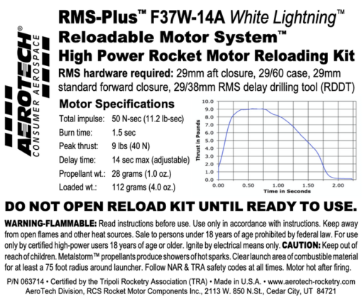 This RMS motor reload utilizes RCSs exclusive White Lightning™ aerospace grade composite propellant formulation, which produces a gorgeous bright white flame with lots of dense white smoke and a throaty roar at lift-off.
