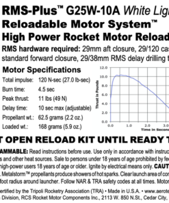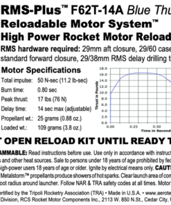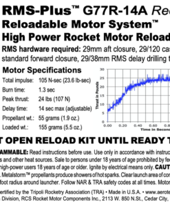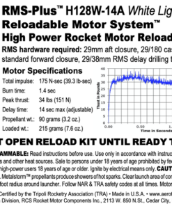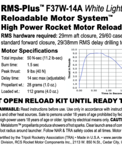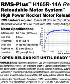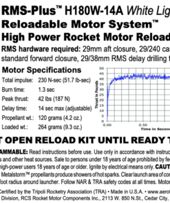 The AeroTech motor reload kit comes with 1 rocket motor reload. Reload kits include all internal motor components and FirstFire™ Initiators. This AeroTech motor is U.S. mailable with no hazmat fee! The sale of this high power motor to persons under 18 years of age is currently prohibited by federal law. This is a High-Power motor requiring Level 1 High-Power certification through NAR or Tripoli to purchase. Orders containing this item will not be shipped until proof of age (such as a copy of a driver’s license) and proof of Level 1 certification is received.