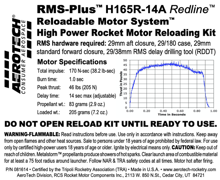 The AeroTech Reloadable Motor System RMS is an aluminum cased reusable motor in kit form that is assembled by the user. You will need AeroTech RMS-29/180 motor hardware to build and complete the motor for many reliable flights. Motor hardware is available separately in a complete set, and also as individual parts. Important: High Power RMS reload kits are not compatible with Mid Power RMS products. You will need to set the desired delay time using the 18-38mm Delay Drilling Tool (RDDT), Not Included. The 18-38mm Delay Drilling Tool (RDDT) is available in the AeroTech Accessories section of this website.