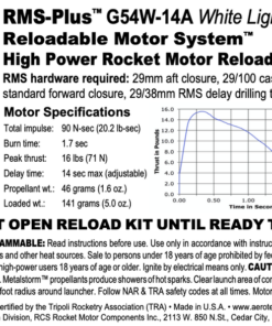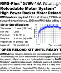 This RMS motor reload utilizes RCSs exclusive White Lightning™ aerospace grade composite propellant formulation, which produces a gorgeous bright white flame with lots of dense white smoke and a throaty roar at lift-off.