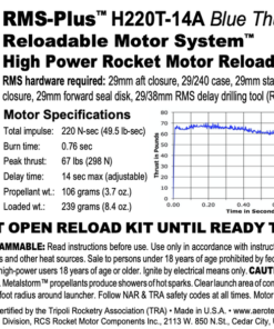 The AeroTech motor reload kit comes with 1 rocket motor reload. Reload kits include all internal motor components and FirstFire™ Initiators. This AeroTech motor is U.S. mailable with no hazmat fee! The sale of this high power motor to persons under 18 years of age is currently prohibited by federal law. This is a High-Power motor requiring Level 1 High-Power certification through NAR or Tripoli to purchase. Orders containing this item will not be shipped until proof of age (such as a copy of a driver’s license) and proof of Level 1 certification is received.