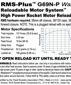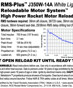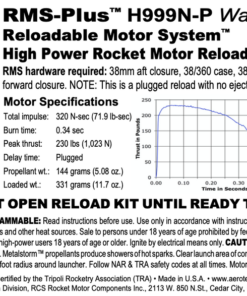 The AeroTech motor reload kit comes with 1 rocket motor reload. Reload kits include all internal motor components and FirstFire™ Initiators. Requires HAZMAT shipping via UPS or FEDEX. The sale of this high power motor to persons under 18 years of age is currently prohibited by federal law. This is a High-Power motor requiring Level 1 High-Power certification through NAR or Tripoli to purchase. Orders containing this item will not be shipped until proof of age (such as a copy of a driver’s license) and proof of Level 1 certification is received.
