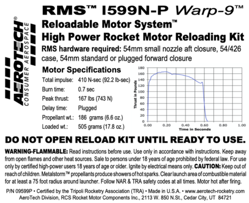 The I599N-P is a Plugged motor reload. Plugged reload kits do not utilize a motor-actuated delay or ejection charge. Plugged motors must be used in conjunction with a timer, altimeter or radio-activated recovery system.