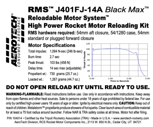 This RMS motor reload utilizes RCSs exclusive Black Max™ aerospace grade composite propellant formulation, which produces a visible black exhaust plume and a denser dark tracking smoke. Black Max™ motors provide a higher level of thrust than White Lightning™ motors of the same total impulse and are perfect for high lift-off acceleration.