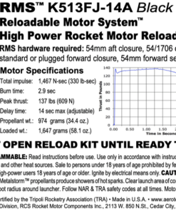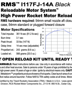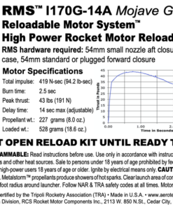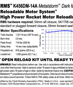 The AeroTech motor reload kit comes with 1 rocket motor reload. Reload kits include all internal motor components and FirstFire™ Initiators. Requires HAZMAT shipping via UPS or FEDEX. The sale of this high power motor to persons under 18 years of age is currently prohibited by federal law. This is a High-Power motor requiring Level 2 High-Power certification through NAR or Tripoli to purchase. Orders containing this item will not be shipped until proof of age (such as a copy of a driver’s license) and proof of Level 2 certification is received.