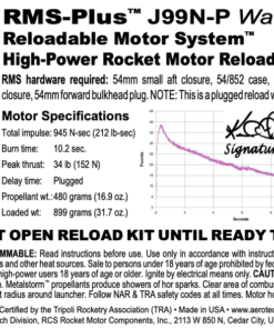 The AeroTech Reloadable Motor System RMS is an aluminum cased reusable motor in kit form that is assembled by the user. You will need AeroTech RMS-54/1280 motor hardware to build and complete the motor for many reliable flights. Motor hardware is available separately in a complete set, and also as individual parts. Important: High Power RMS reload kits are not compatible with Mid Power RMS products. You will need to set the desired delay time using the 54mm Delay Drilling Tool (54RDDT), Not Included. The 54mm Delay Drilling Tool(54RDDT) is available in the AeroTech Accessories section of this website.