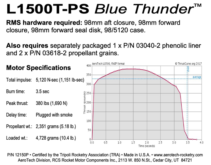 This RMS motor reload utilizes RCSs exclusive Blue Thunder™ aerospace grade composite propellant formulation, which produces a gorgeous bright violet-blue flame with a minimum of exhaust smoke. Blue Thunder™ motors provide a higher level of thrust than White Lightning™ motors of the same total impulse and are perfect for high lift-off acceleration.