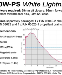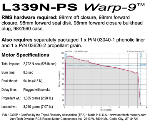 This RMS motor reload utilizes RCSs exclusive Warp-9™ aerospace grade composite propellant formulation, which produces a prominent yellow-orange flame studded with “mach diamonds.” Warp-9 is AeroTech’s fastest burning propellant. Originally developed for Orbital’s Pegasus® fin motors, Warp-9 is perfect when you need the highest thrust possible from a given motor size.