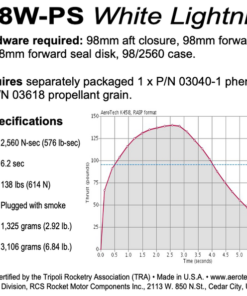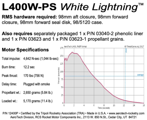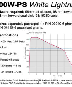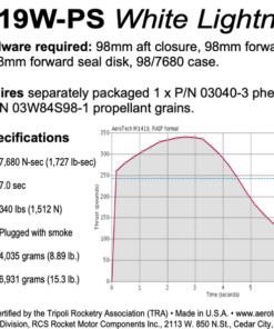 This RMS motor reload utilizes RCSs exclusive White Lightning™ aerospace grade composite propellant formulation, which produces a gorgeous bright white flame with lots of dense white smoke and a throaty roar at lift-off.