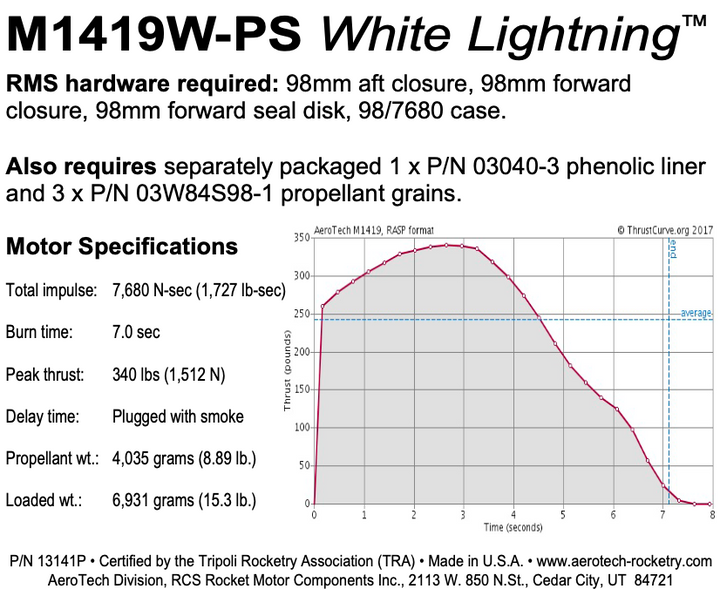 This RMS motor reload utilizes RCSs exclusive White Lightning™ aerospace grade composite propellant formulation, which produces a gorgeous bright white flame with lots of dense white smoke and a throaty roar at lift-off.