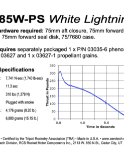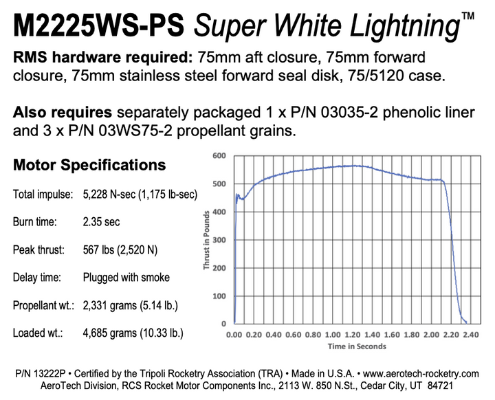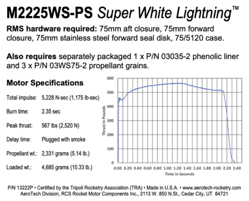 The M225WS-PS uses AeroTech’s high-performance Super White Lightning propellant formulation producing the brightest possible white flame and brilliant exhaust plume at lift-off, plus a higher “specific impulse” or Isp and higher thrust level than our standard White LightningTM propellant. This new motor delivers an impressive 5,205 N-Sec. (1,170.2 lb.-Sec.) of total Impulse, with a burn time of 2.32 seconds and a peak thrust of 2,418 N (543.6 lbs.). The reload kit propellant weight is 2,331 g (5.13 lbs.) with an all-up motor system weight of 4,685 g (10.32 lbs.). This Super White Lightning rocket motor produces lots of bright white smoke and a real throaty roar at lift-off, plus tracking smoke, however it is a “plugged” motor that does not include an ejection charge, requiring the utilization of an electronically-activated recovery system. The M2225WS-PS rocket motor is perfect for Level 3 certification attempts or extreme high performance flights.