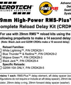 The AeroTech RMS-Plus™ CRDK38-07 is for use with RMS-38 J510W White Lightning™ reload motors using the 14 second adjustable delay. The motor complete reload delay kit comes with 1 rocket motor delay element, and insulators and spacers (if needed). Other motor delay parts are supplied with the RMS reload kits. Important: High Power RMS reload delay kits are not compatible with Mid Power RMS products.
