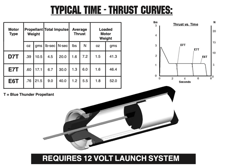 The E7-RCT is a Plugged motor reload. Plugged reload kits do not utilize a motor-actuated delay or ejection charge. Plugged motors must be used in conjunction with a timer, altimeter or radio-activated recovery system. This motor was designed primarily for R/C rocket gliders.
