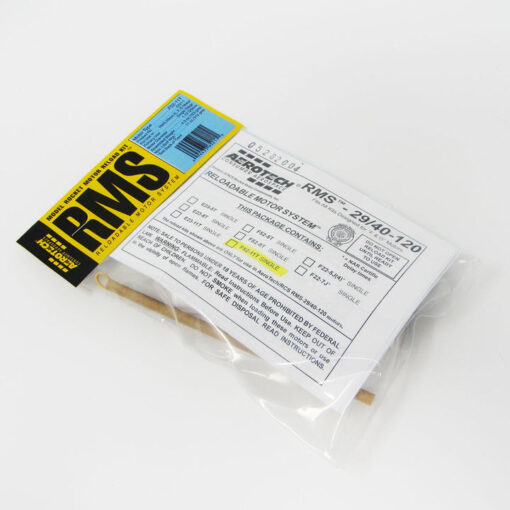 The AeroTech Reloadable Motor System RMS is an aluminum cased reusable motor in kit form that is assembled by the user. You will need AeroTech RMS-29/40-120 motor hardware to build and complete the motor for many reliable flights. Motor hardware is available separately in a complete set, and also as individual parts. Important: Mid Power RMS reload kits are not compatible with High Power RMS products. This RMS motor reload utilizes RCSs exclusive Blue Thunder™ aerospace grade composite propellant formulation, which produces a gorgeous bright violet-blue flame with a minimum of exhaust smoke. Blue Thunder™ motors provide a higher level of thrust than White Lightning™ motors of the same total impulse and are perfect for high lift-off acceleration.