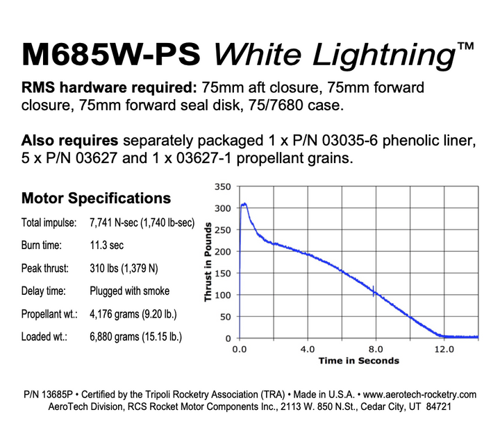 This RMS motor reload utilizes RCSs exclusive White Lightning™ aerospace grade composite propellant formulation, which produces a gorgeous bright white flame with lots of dense white smoke and a throaty roar at lift-off.