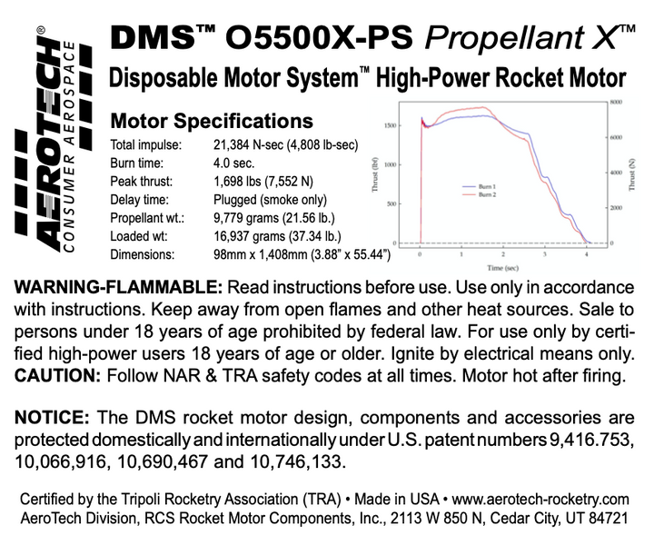 The O5500X-PS (P/N 15550P) motor uses AeroTech’s high-Isp Propellant X™ to produce an exceptionally high total impulse, accompanied by a bright white flame with a moderate amount of smoke. The motor delivers 21,384 N-sec (4,808 lb. sec) of total impulse in 4.03 seconds making it ideal for extreme high-altitude attempts (including two-stage flights to the edge of outer space!) and sport flights in heavy weight rockets. The O5500X-PS is a “plugged” motor that produces tracking smoke only, and cannot be configured with an integral ejection charge. Rockets using 75 and 98mm DMS motors must utilize an electronically-activated recovery system.