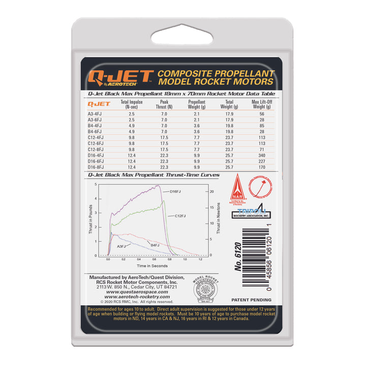 Quest Q-Jets are the world’s most advanced 18mm model rocket motors. Q-Jet™ high performance, composite propellant model rocket motors use the same family of solid propellant as NASA’s Space Shuttle Boosters, military missiles, sounding rockets, and NASA’s future SLS moon rocket. They utilize a patent pending high-strength polymer case and bulkhead, ceramic nozzle and RCSs exclusive Black Max™ aerospace grade composite propellant formulation, which produces nearly double the specific impulse (or ISP, a propellant efficiency rating) of conventional black powder propellant. They are not susceptible to thermal cycling like black powder motors. Q-Jet™ rocket motors deliver faster lift-offs, visible exhaust plume, denser dark tracking smoke & increased reliability at lift-off.